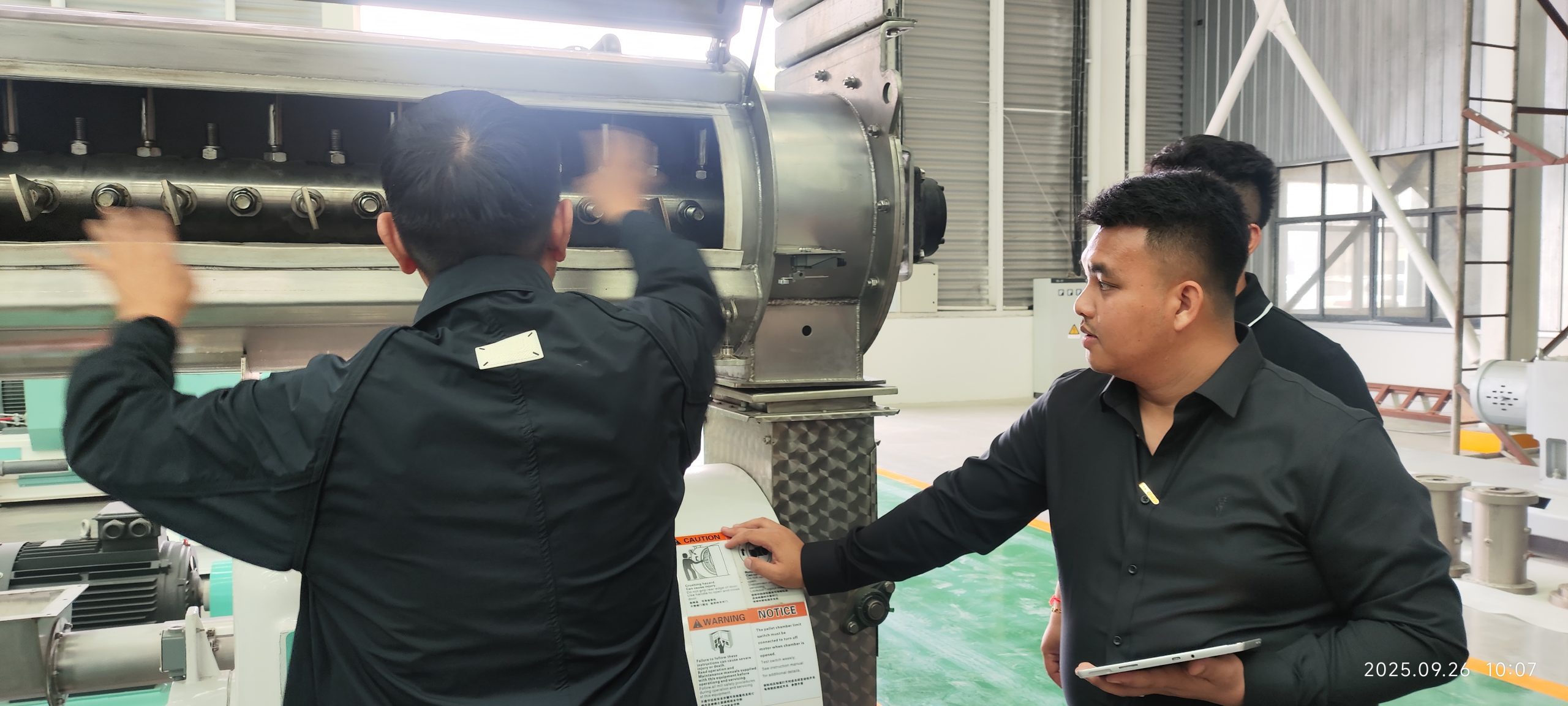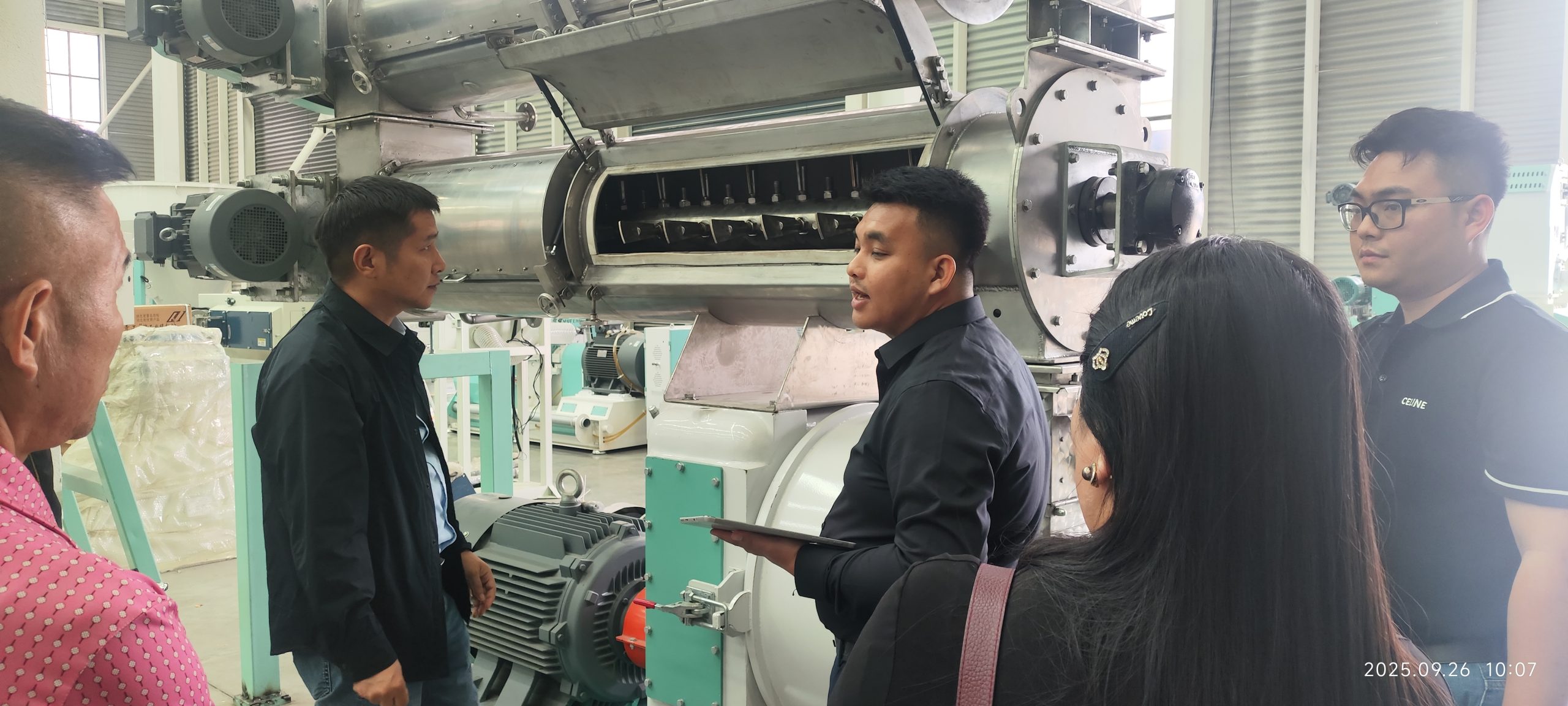 The Laotian customer has their own feed factory, and in order to further improve production capacity and product quality, they plan to add a 350 pellet feed production line on the basis of the existing feed factory. During the visit, they went deep into the production workshop to gain a detailed understanding of the production process, performance parameters, and automation level of the equipment. Modern production equipment, rigorous quality control, and efficient production processes have left a deep impression on Laotian customers. They have shown a strong interest in the company’s equipment and occasionally raise various questions, which are patiently answered by the company’s professional technical personnel.